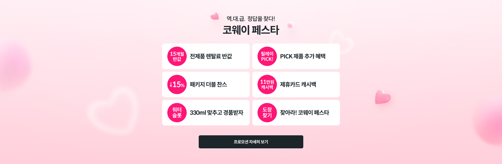 • 코웨이닷컴 로그인 후 참여가 가능하며, 당첨 발표 전 회원 탈퇴 시 이벤트 응모가 자동 취소됩니다.